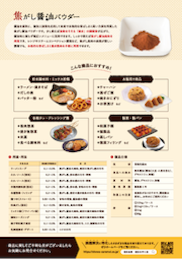 本醸造醤油を原料にした自然で本格的な香ばしさを持った焦がし醤油パウダーです。糖加工技術の応用により、焦がし醤油本来の自然な風味と高い力価を再現しました。